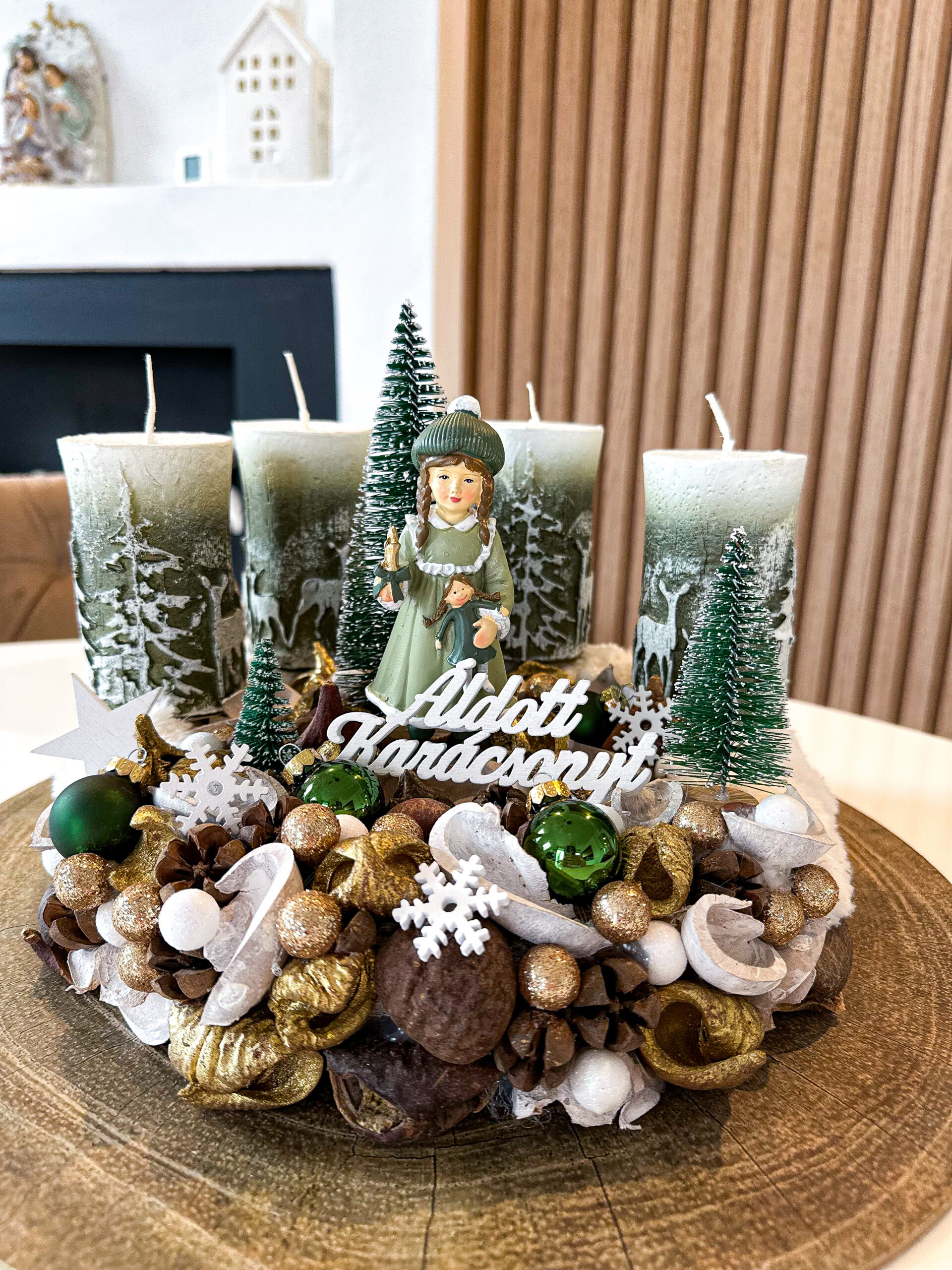 Központi Figura: A kompozíció közepén egy bájos, téli ruhás figura áll (vagy egy „Áldott Karácsonyt” felirat), apró fenyőkkel és csillogó zöld, valamint arany gömbökkel körülölelve.
