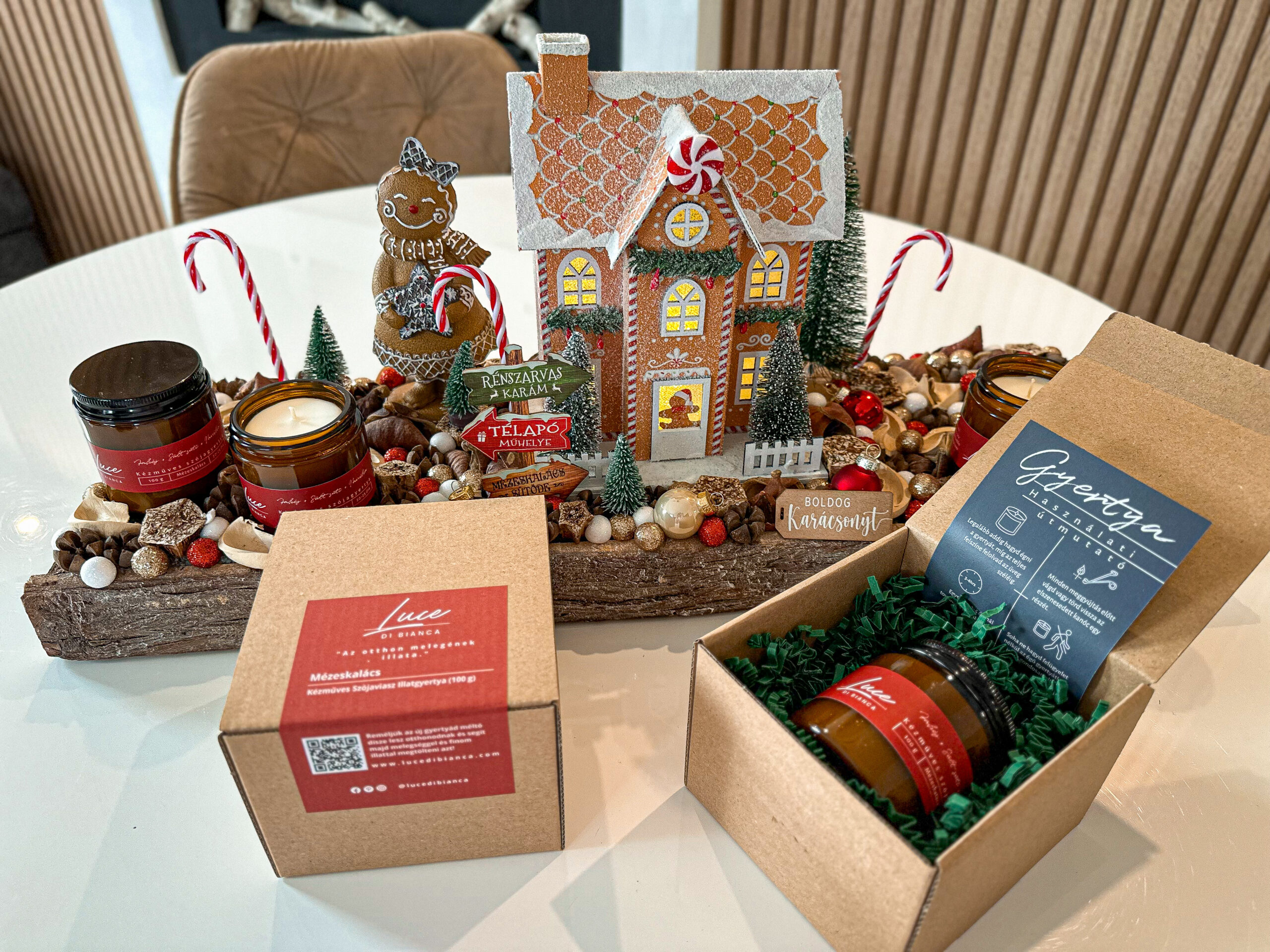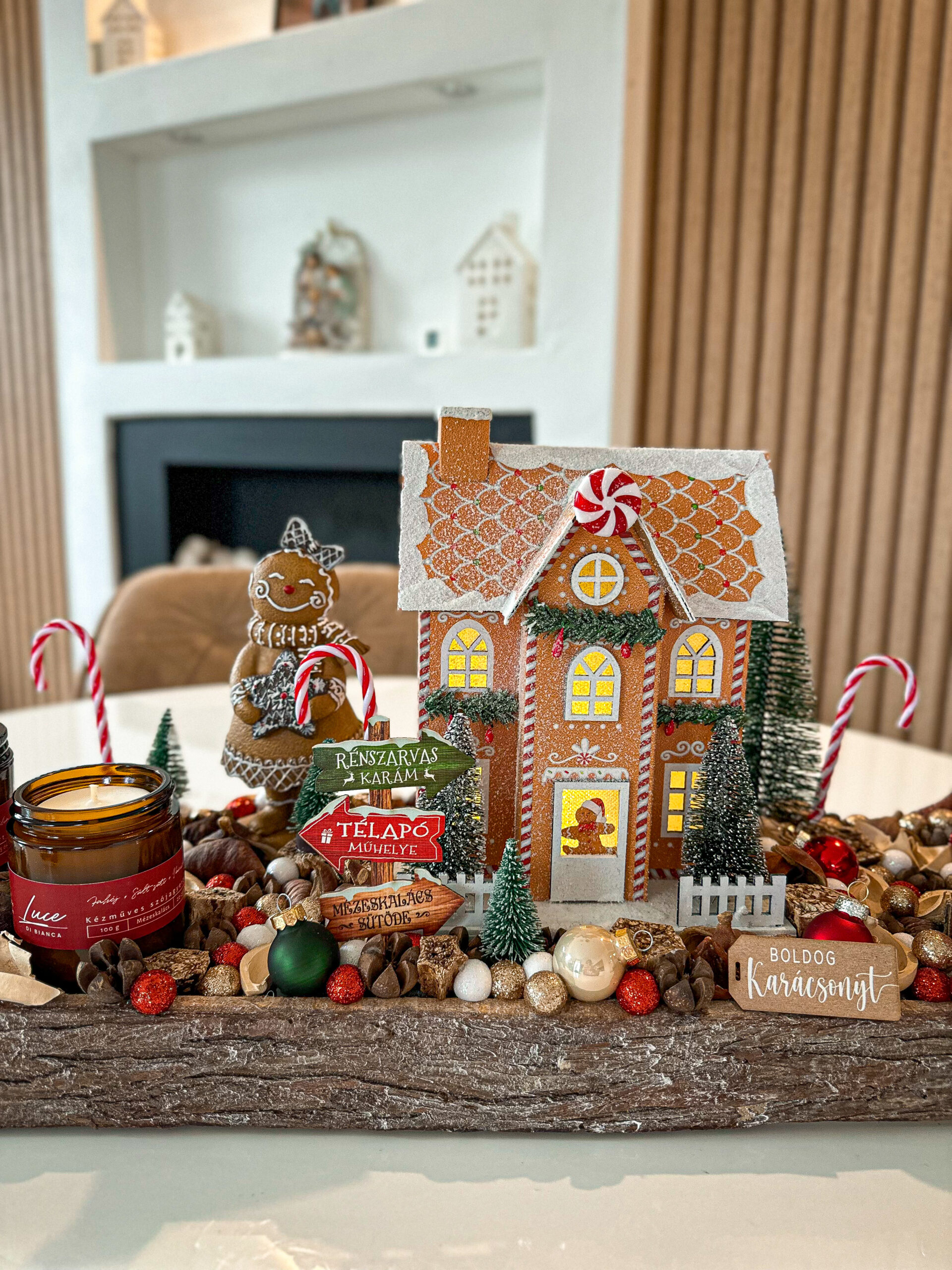 A teljes kompozíciót a mézeskalács varázslatos világa ihlette. A klasszikus piros és zöld színek, a bájos mézeskalács házikó és a gondosan válogatott termések azonnal meghitt hangulatot teremtenek.