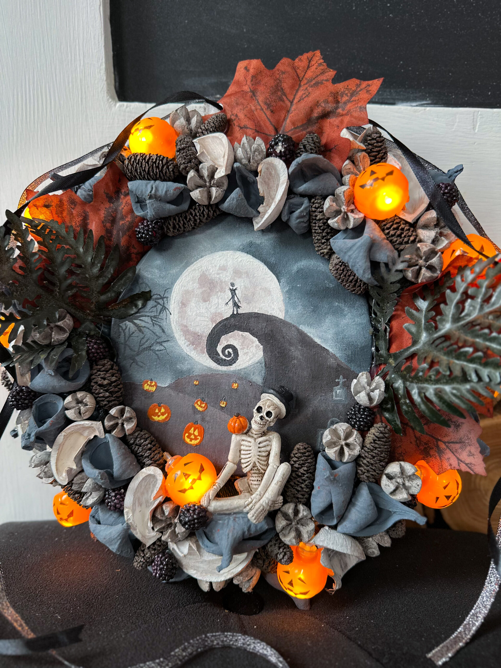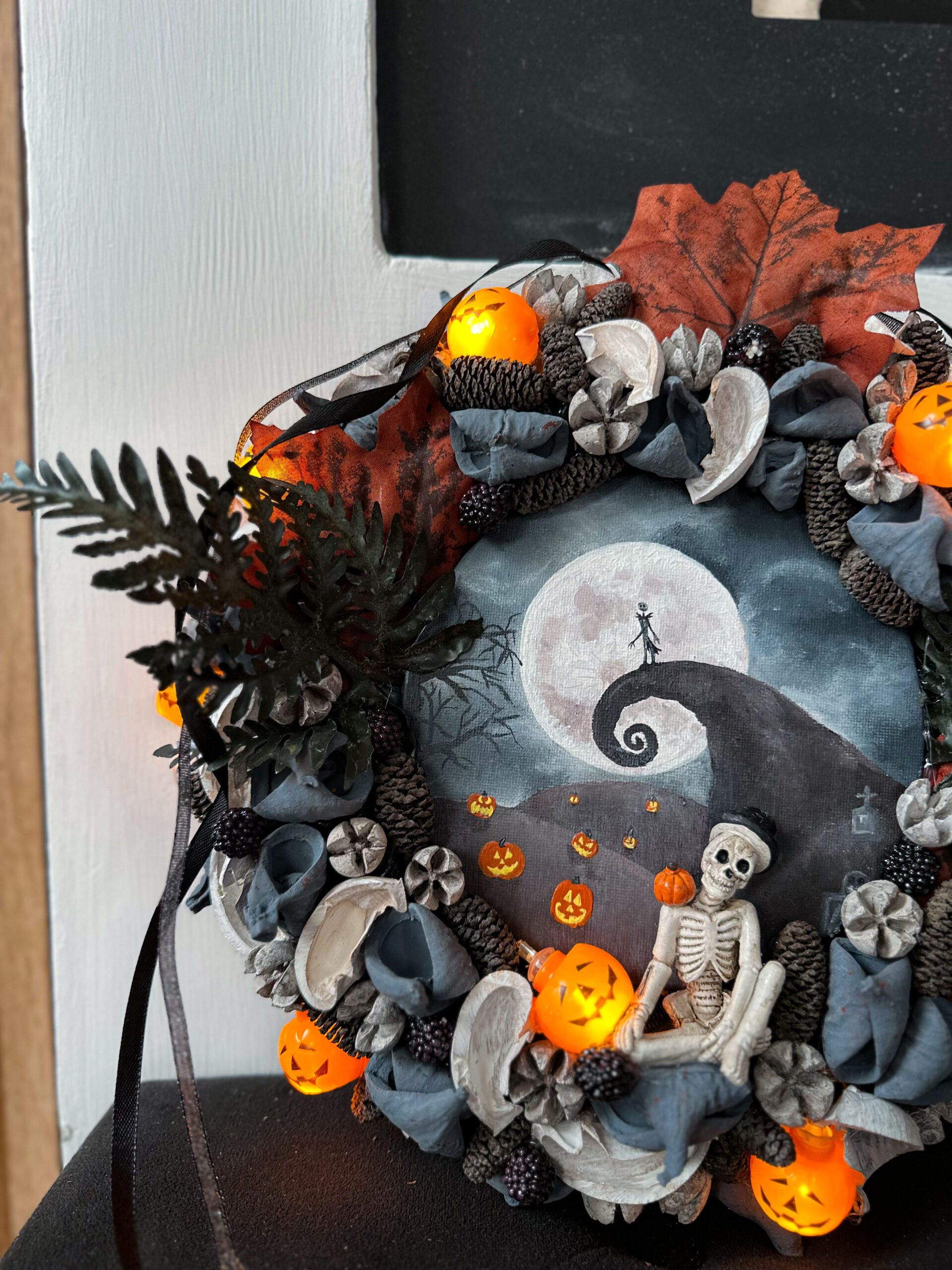Dobd fel otthonod vagy ajtód hangulatát ezzel az egyedi, kézzel készített Halloween kopogtatóval! Az ajtódísz közepén egy kör alakú festővászon található, amit saját műhelyünkben festünk meg, így minden darab egy igazi műalkotás és teljesen egyedi.