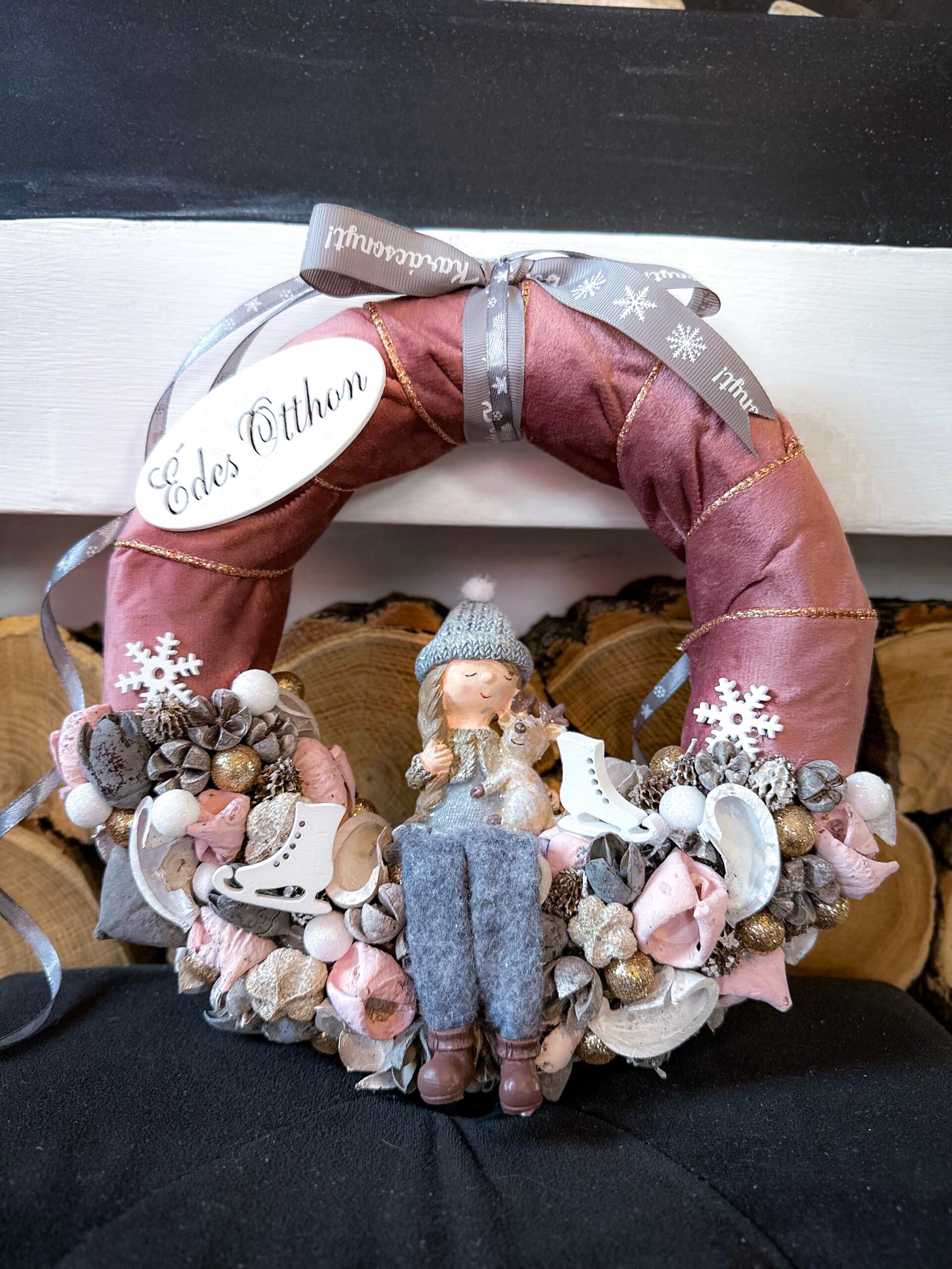 Ez a különleges, rózsaszín-ezüst karácsonyi kopogtató garantáltan elvarázsolja az otthonod. A puha, mályvás rózsaszín textillel bevont alapon egy bájos, sapkás téli figura, apró korcsolyák és csillogó, ezüst-arany karácsonyi díszek elevenítik meg a téli mesét. A „Édes Otthon” felirat és a finom, hópelyhes szalag teszi teljessé ezt az egyedi ajtódíszt. Ideális választás, ha egy modern, elegáns és mégis meghitt hangulatú téli dekorációt keresel a bejárati ajtóra vagy a lakás bármely pontjára.