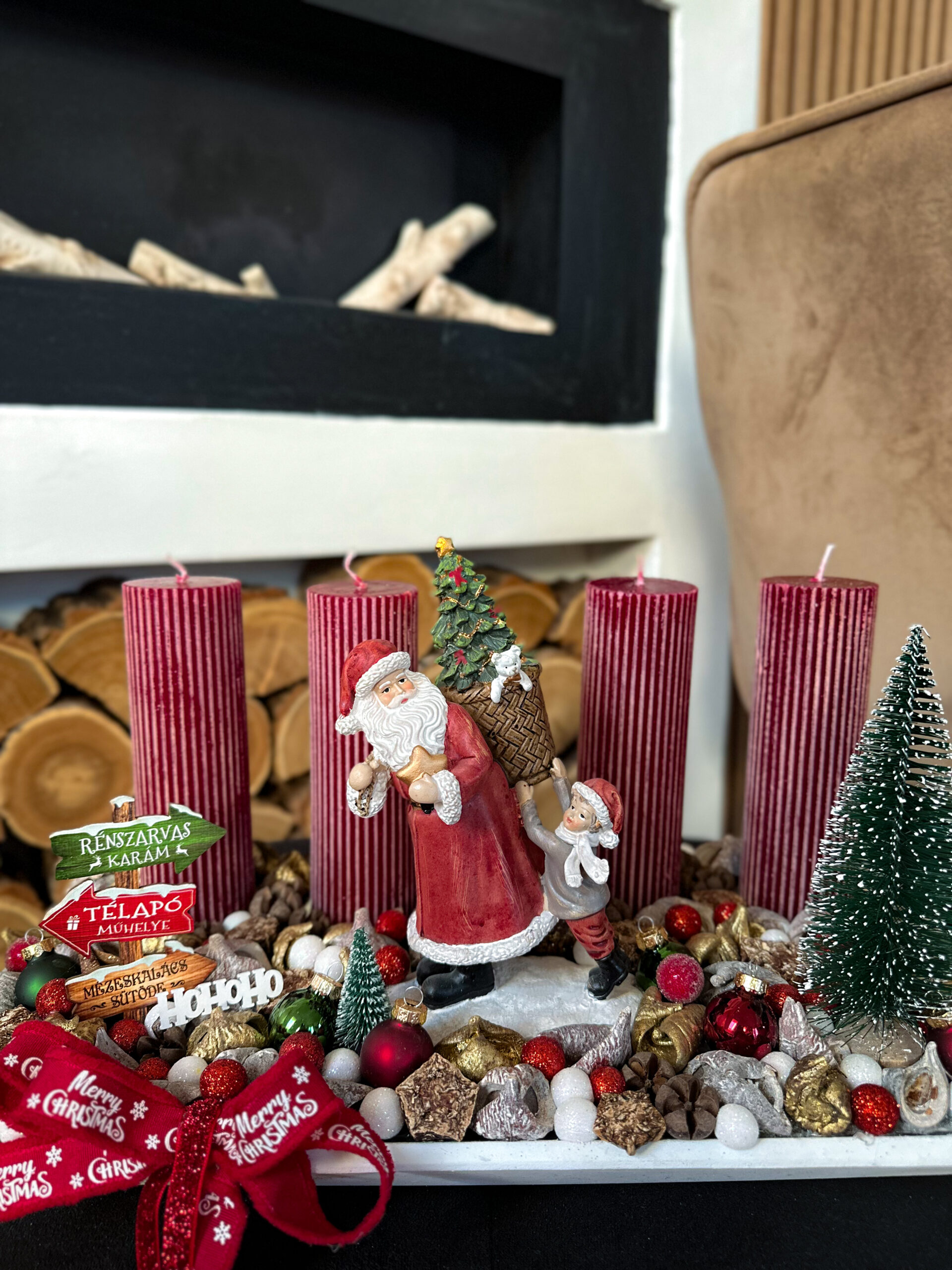 A „Télapó Műhelye” és a „Rénszarvas Karám” feliratú fatáblák teszik teljessé a jelenetet, melyet négy elegáns, bordó hengergyertya ölel körül. Ez a tál nem csupán egy adventi koszorú, hanem egy teljes ünnepi történetet mesél el az asztalodon.